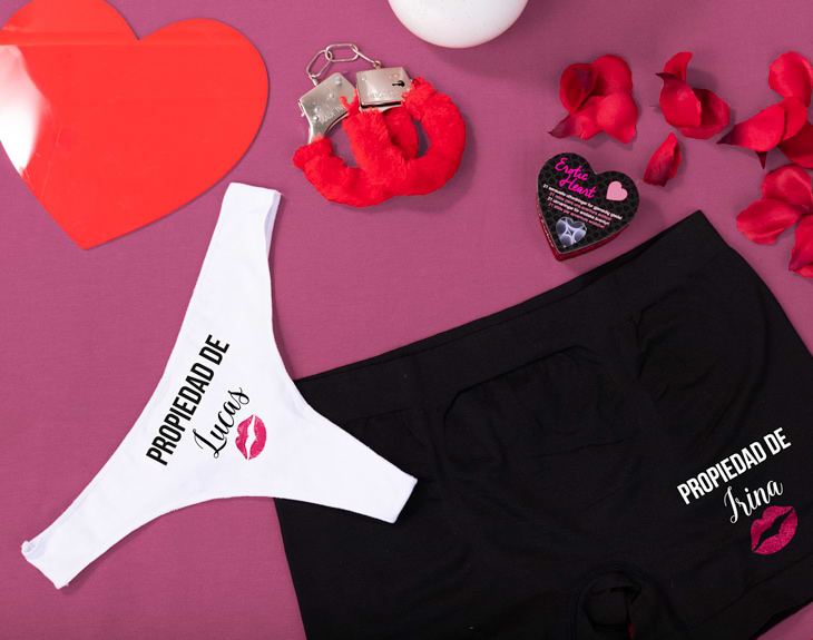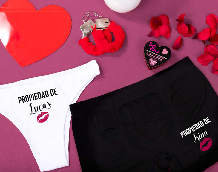 ¿Estás preparado/a para tener una noche de pasión con tu pareja? Sorprendela con este pack erótico con diseño "Propiedad de...". Vuestras noches de pasión se volverán inolvidables. Está pensado para esas parejas juguetonas, es ideal para avivar la llama de la relación. Este set viene con un calzoncillo de color negro, un tanga blanco, unas esposas con felpa, un juego erotico y un montón de pétalos. Sin duda, será un regalo picante y erótico, perfecto para que disfrutéis el uno del otro hasta que salga el sol. ¡Ideal para celebrar vuestro aniversario con una gran noche de amor y pasión! Por último, podrás personalizar la ropa interior de este pack erótico. El primer paso a seguir consiste en añadir el producto al carrito y entrar al área de personalización. Una vez ahí, ya puedes escribir vuestros nombres. Pronto estará perfecto y listo para disfrutar. ¡Un original regalo para parejas picantes! Características de braga: Medidas: 31 x 23 cm. Talla: S, única. Material: : 95% algodón, 5% elastano Características del tanga: Medidas: 33,5 x 21,5 cm. Talla: M, única. Material: algodón natural. Características del calzoncillo: Talla: - Talla M: 33,5 x 25 centímetros. - Talla L: 36 x 26 centímetros. - Talla XL: 43 x 29 centímetros. Material: poliamida (90%) y elastano (10%). Color: negro. Importante: esta prenda se puede meter en la lavadora a una temperatura máxima de 30 grados. No es recomendado usar lejía ni secarlo en la secadora. La temperatura máxima de la base de la plancha debe ser de 110 grados. No lavar en seco.