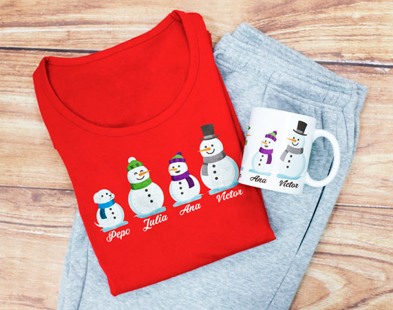 ¿Todavía no sabes qué regalar estas navidades? Este pack personalizado es perfecto para sorprender tanto a pequeños como a mayores. Incluye un pijama y una taza con la familia más navideña...¡La de muñecos de nieve! Solo tienes que escoger los dibujos que más se parezcan a vosotros y decirnos los nombres. ¡Le gustará muchísimo! Material: - Camiseta invierno: 100% algodón (excepto color gris: 85% algodón / 15% viscosa). - Camiseta verano: 100% algodón (excepto color gris: 85% algodón / 15% viscosa). - Pantalón invierno: 100% algodón. - Pantalón verano: 100% algodón. Importante: Las medidas son aproximadas, pueden variar 5cm por encima o por debajo. Importante: el tono de los colores puede variar en intensidad según stock
