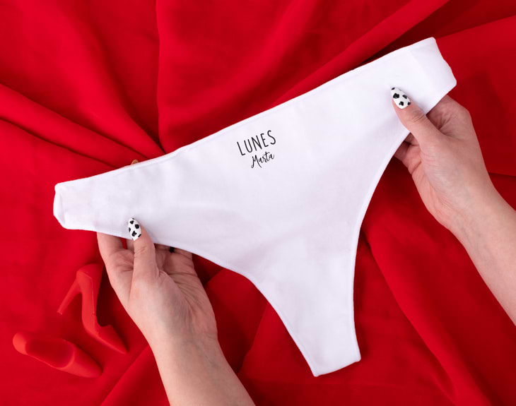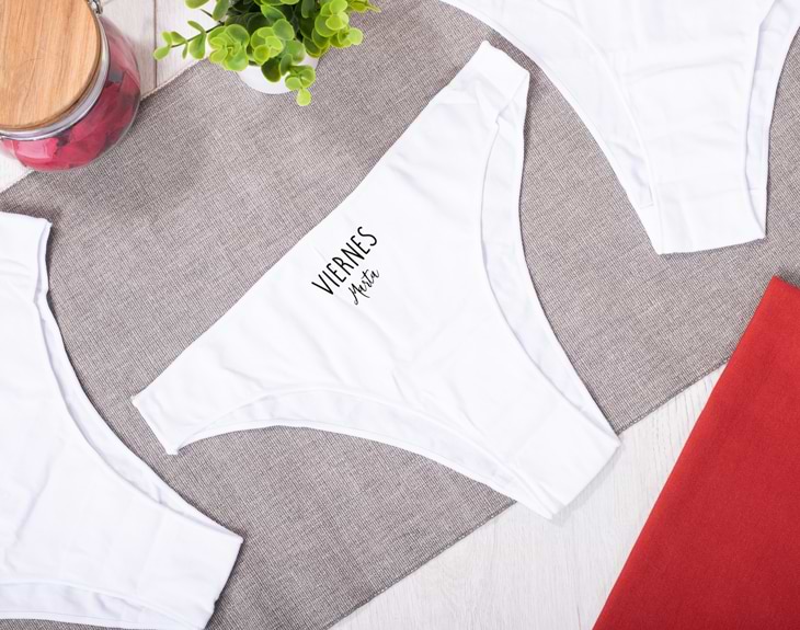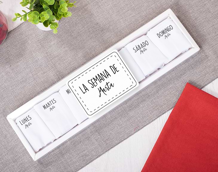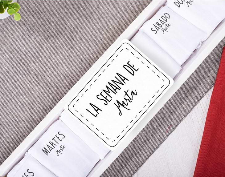 Si buscas sorprender a esa persona tan especial, tenemos este original regalo que la dejará sin palabras. Se trata de nuestro pack de siete bragas con diseño "Días de la semana". Es ideal para regalar por un cumpleaños, Aniversario, un amigo invisible o para cualquier ocasión especial. ¡Acertarás seguro! Este set de ropa interior personalizada viene con una prenda para cada día de la semana. Y lo mejor de todo: tiene el diseño con el nombre de cada día, para que sepas cual ponerte a la semana. Además, es personalizable. Puedes escribir el nombre que tú quieras en cada una de ellas. Y existe la opción de elegir entre tanga o braga, ¡lo que más cómodo te resulte! Personalizar este pack de siete bragas es súper sencillo. El primer paso a seguir consiste en añadir el producto al carrito y entrar al área de personalización. Una vez ahí, ya solo tienes que escribir el nombre que tú quieras y nosotros nos encargamos de todo lo demás. Pronto estará perfecto y listo para regalar. ¡Será un original regalo! Características de braga: Medidas: 31 x 23 cm. Talla: S, única. Material: : 95% algodón, 5% elastano Características de tanga: Medidas: 33,5 x 21,5 cm. Talla: M, única. Material: algodón natural. Importante: esta prenda se puede meter en la lavadora a una temperatura máxima de 30 grados. No es recomendado usar lejía ni secarlo en la secadora. La temperatura máxima de la base de la plancha debe ser de 110 grados. No lavar en seco.