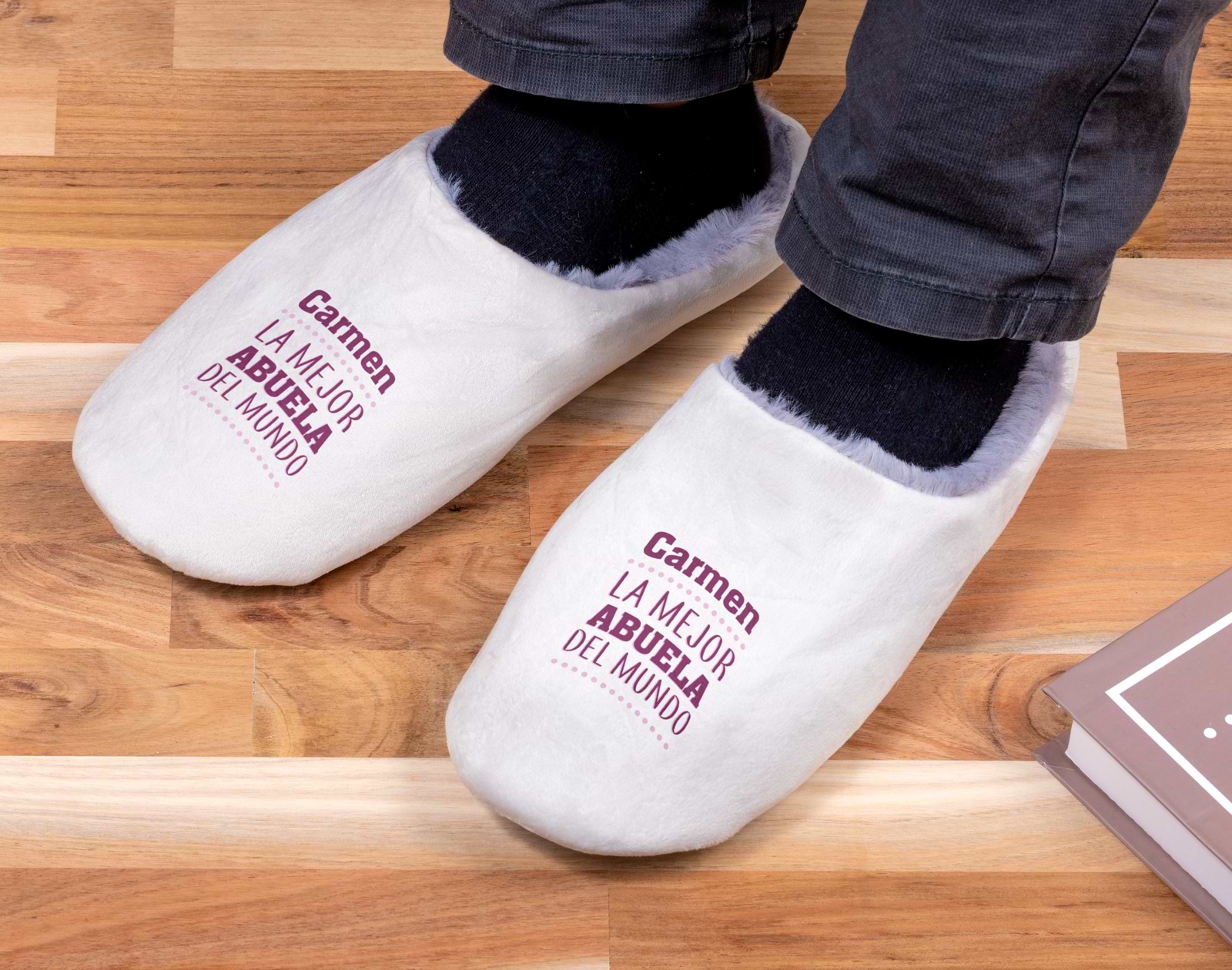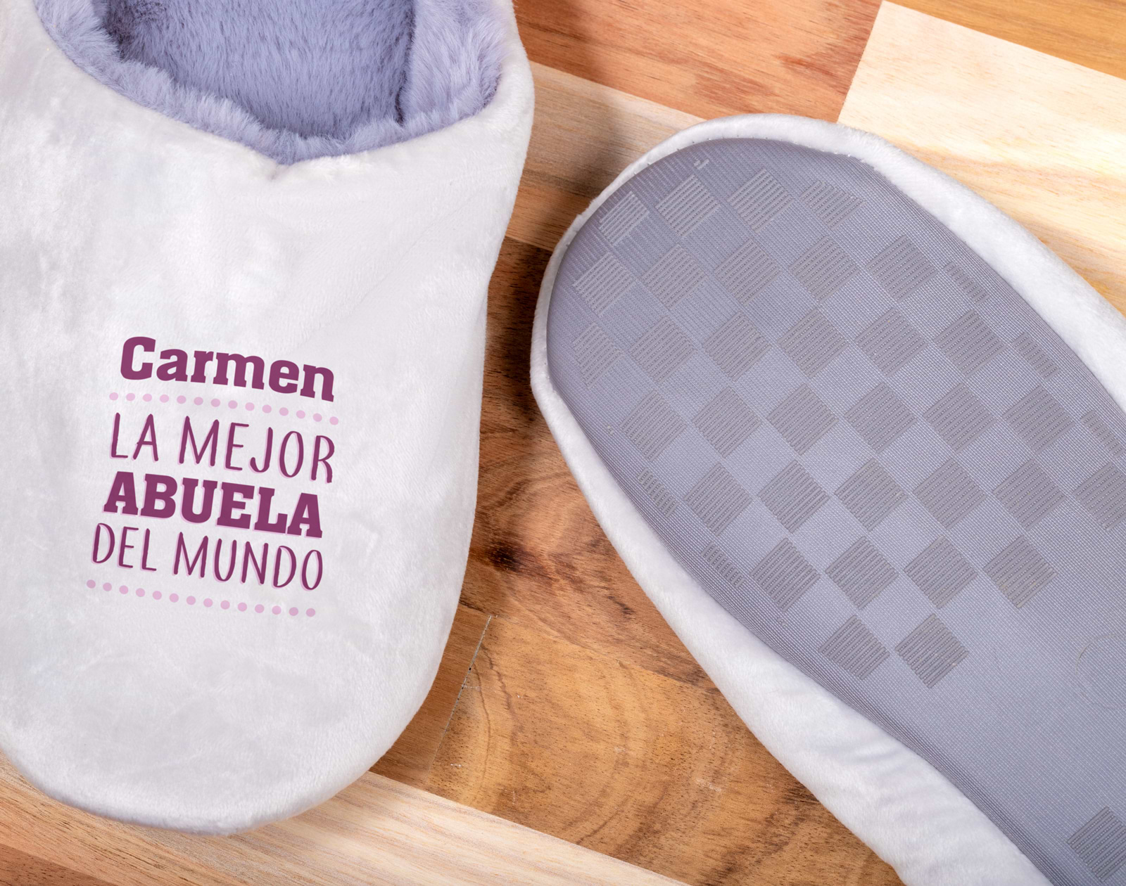Porque hay abrazos que solo una abuela sabe dar… y momentos que solo ella puede hacer tan especiales. Estas pantuflas personalizadas para la mejor abuela del mundo son un homenaje a su cariño infinito. Con un diseño adorable y lleno de ternura, estas pantuflas llevan el mensaje “La mejor abuela del mundo”, y son personalizables: puedes añadir su nombre para convertirlas en un detalle único, hecho con amor. Están fabricadas en algodón suave, con exterior en tono natural, interior acolchado en gris y suela antideslizante. Cómodas, calentitas y seguras, para que cada paso que dé por casa sea tan agradable como una de sus historias. Son perfectas para sorprenderla en su cumpleaños, en el Día de la Madre o simplemente para decirle “te quiero” de una forma diferente y especial. Personalizarlas es muy fácil: añade el producto al carrito, entra en nuestro diseñador y completa el diseño con su nombre. ¡Nosotros nos encargamos del resto para que tengas un regalo original para tu abuela! Talla: 26 cm x 11,5 cm (36-38) Material: algodón/poliéster.