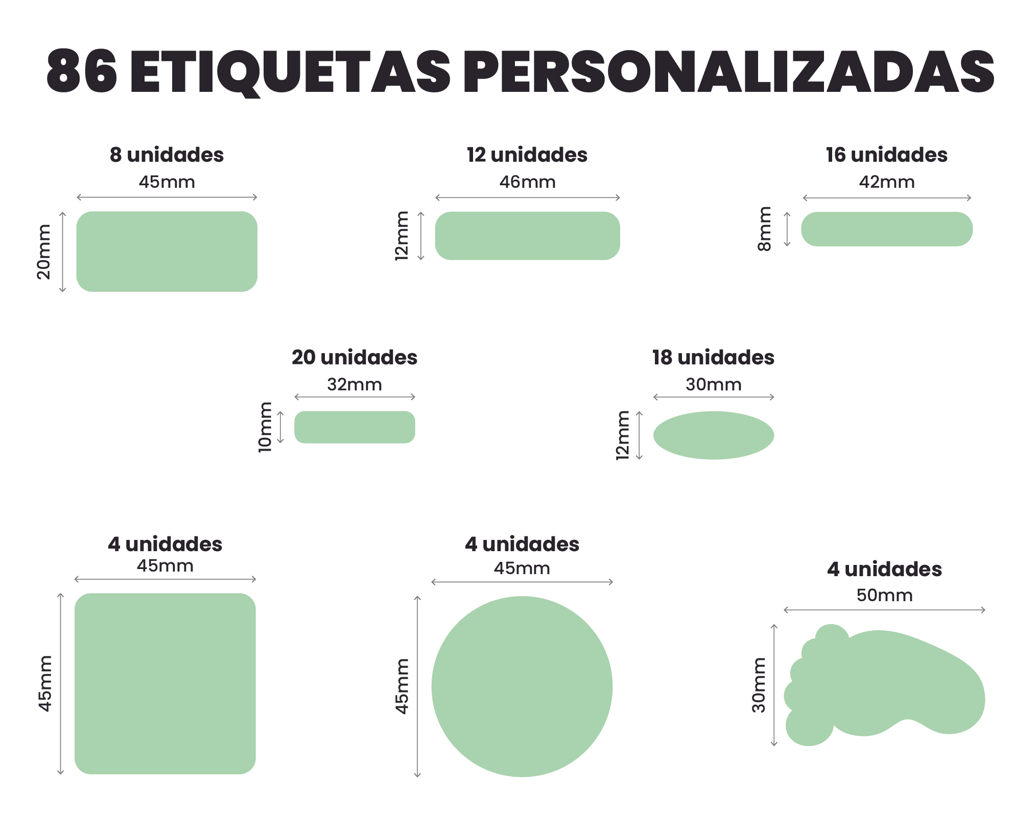 • 86 etiquetas personalizadas. • Estuche de color personalizado. • Tarjeta Recordatoria.