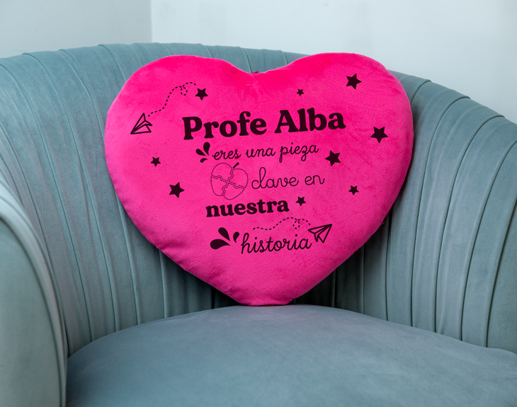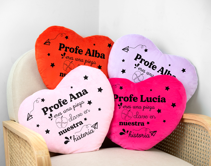 Ser profe a veces puede ser un trabajo realmente agotador... Y que mejor que regalar a vuestro profe algo para ayudarle a descansar, como por ejemplo, este cojín personalizado en forma de corazón que seguro que le deja sin palabras. ¡Es un regalazo! Ahora que se acerca fin de curso, es el mejor momento para sorprender a vuestro profe con este original regalo que seguro que le va a encantar. Su diseño es perfecto para agradecerle todo lo que ha trabajado durante este año y también para decirle que necesita un merecido descanso. ¡Tenemos cuatro colores disponibles! El primer paso para personalizar este cojín ea acceder a nuestro diseñador. Una vez dentro, solo tienes que completar el diseño con el nombre de ese profesor o profesora que tanto os ha enseñado. Después elige uno de los cuatro colores y listo. ¡Será el mejor regalo para profes! Material: 100% poliéster. Medidas: 38 x 32 x 3 cm.