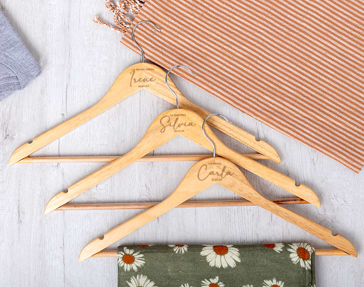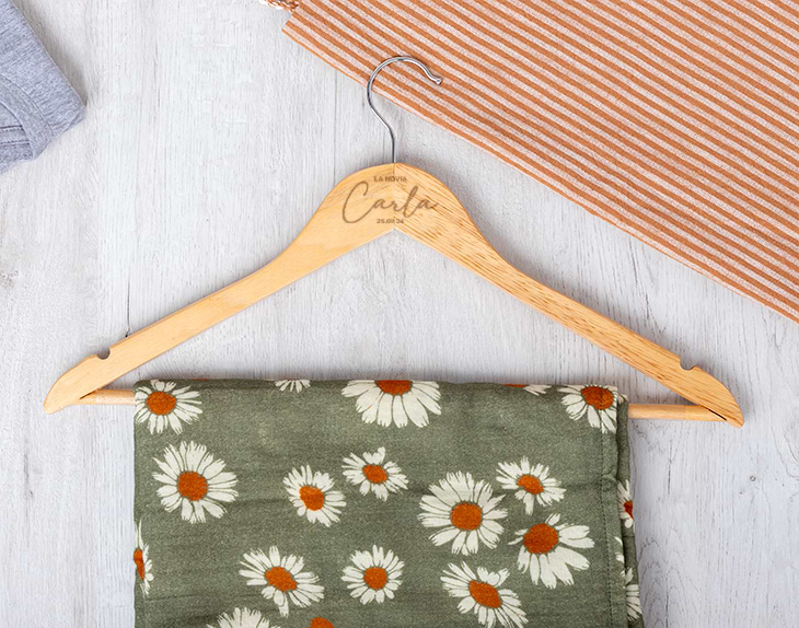 Si dentro de poco, alguna de tus amigas se va a casar, este detalle es perfecto. Se trata de esta percha personalizada. ¡Es el regalo perfecto para novias! Lo mejor es que son personalizables, podrás escribir el nombre de la novia junto con la fecha de su boda. ¡Le encantará! Además de ser un regalo súper original y personal, tiene mucha utilidad. Esta percha conseguirá mantener toda la ropa bien ordenada y organizada. Así cuando vaya a escoger el outfit diario, verá con más claridad todo lo que tiene y la elección será mucho más rápida. Imagina la ilusión que le hará a la novia recibir este pequeño detalle de uno de los días más especiales de su vida, no podrá evitar sonreír. Para personalizar esta percha, lo primero es añadir el producto al carrito y entrar al área de personalización. Una vez ahí, escribes los nombres que quieras y nosotros no encargamos del resto.