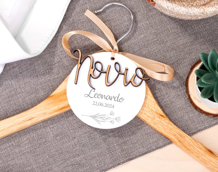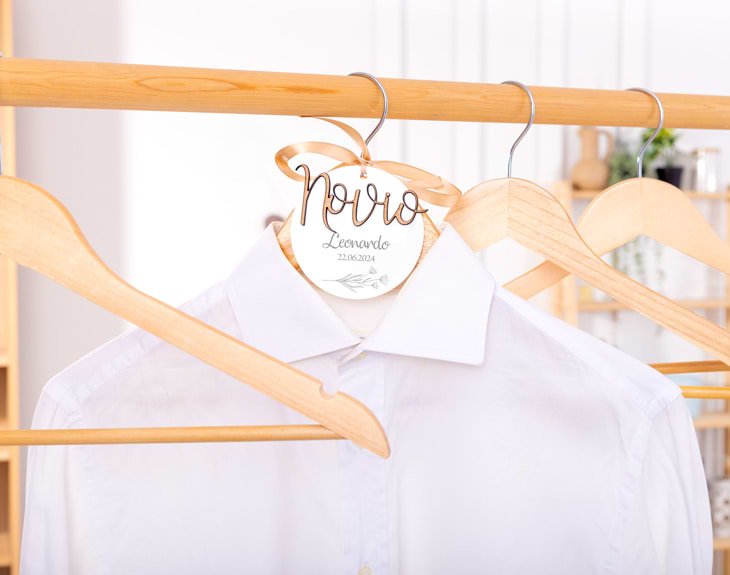 Una boda siempre es un día súper especial y romántico. Están hechas para celebrar el amor por todo lo alto. Es un día en el que se reúnen familiares y amigos junto con los novios para comer, beber, bailar y brindar por este amor. Y para que una boda salga a la perfección hay que cuidar todos los pequeños detalles. Por eso, nuestra percha personalizada para novios es algo que no puede faltar. Es ideal para colgar el esmoquin del novio o el vestido de la novia. La percha está fabricada con madera y tiene un accesorio de metacrilato. Lo más especial que tiene, es que es personalizable. Podrás escribir el nombre del novio y la fecha de ese día tan especial en el accesorio. Imagina la ilusión que le hará recibir este detalle tan bonito, sin duda, le encantará. ¡Será un recuerdo inolvidable! Por último, personalizar esta percha con metacrilato es súper sencillo. El primer paso a seguir consiste en añadir el producto al carrito y entrar al área de personalización. Una vez ahí, ya puede escribir el nombre del novio o la novia junto con la fecha de este día tan especial. Pronto estará perfecta y lista para regalar. ¡Será un original regalo para bodas!