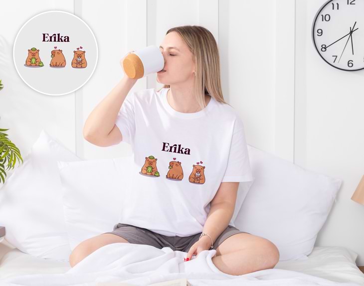 Si hablamos de pijamas, todos usamos uno cada noche, y es una de esas prendas que solemos renovar con frecuencia, ya sea por desgaste o por el cambio de estación. Por eso, te presentamos este pijama personalizado con un diseño de capibaras tan divertido que hará que tus noches sean aún más especiales. Puedes elegir el pijama que más te guste: verano, con manga corta y pantalón corto, o invierno, con manga larga y pantalón largo. Además, podrás seleccionar el color de la camiseta y la talla que necesites. Nuestros dulces sueños ya no serán nada aburridos. Es el regalo para cumpleaños, Navidad, Reyes o cualquier ocasión especial. Personalizarlo es muy sencillo: añade al carrito el pijama que prefieras, accede al área de personalización, elige entre los diseños de capibaras más divertidos, selecciona el color y la talla, escribe el nombre que quieras en el recuadro correspondiente y listo. El regalo original más bonito del mundo estará en camino. Material: - Camiseta invierno: 100% algodón (excepto color gris: 85% algodón / 15% viscosa). - Camiseta verano: 100% algodón (excepto color gris: 85% algodón / 15% viscosa). - Pantalón invierno: 100% algodón. - Pantalón verano: 100% algodón. Importante: Las medidas son aproximadas, pueden variar 5cm por encima o por debajo. Importante: el tono de los colores puede variar en intensidad según stock