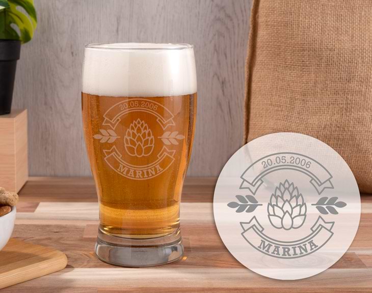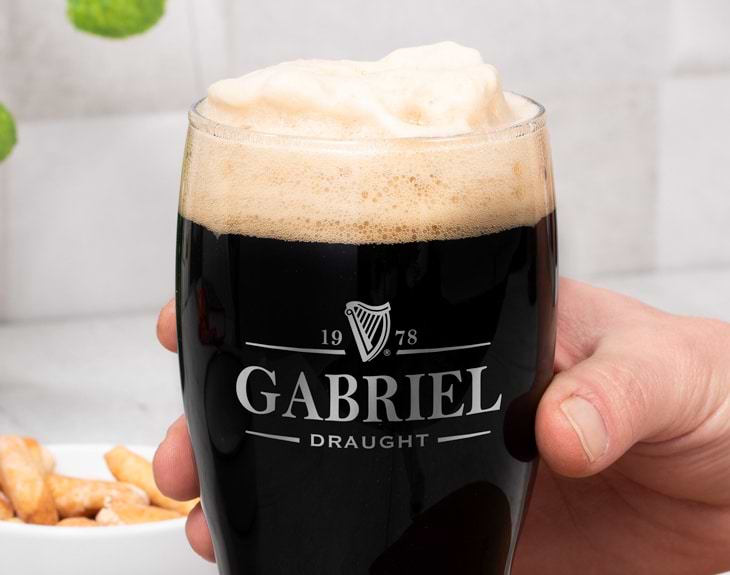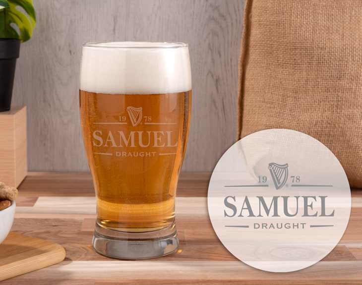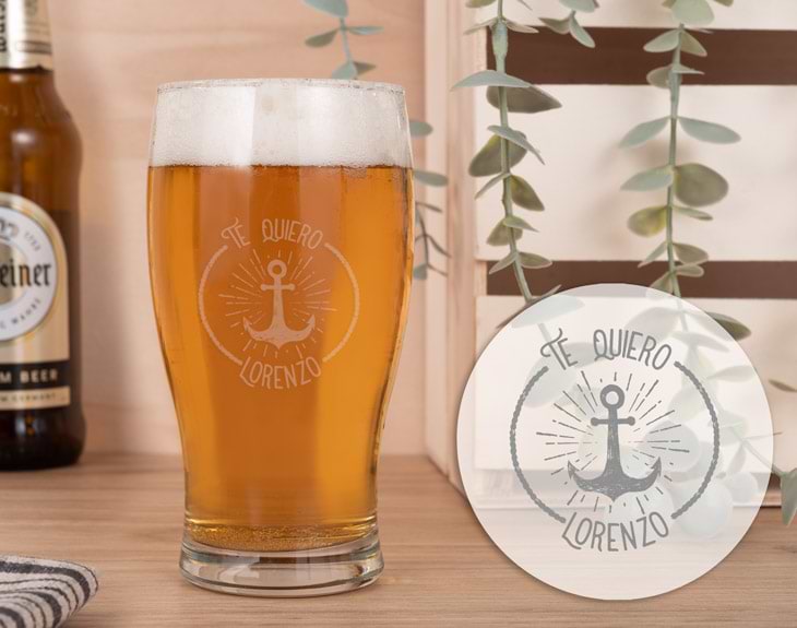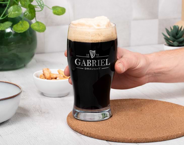Inspirado en la tradicional cerveza negra Guinness, el diseño de esta pinta de cerveza personalizada recuerda al sabor, textura y color de una de las mejores cervezas de Irlanda. Si tienes un amigo que no puede vivir sin su Guinness, este regalo original le va a sorprender. Una jarra de cerveza grabada con un diseño exquisito y con el nombre y fecha de nacimiento del afortunado. Si Irlanda es el sueño de tu pareja, disfrutad de las tardes de cerveza con una jarra personalizada al más puro estilo irlandés. Capacidad: 38 cl. Altura: 14 cm.