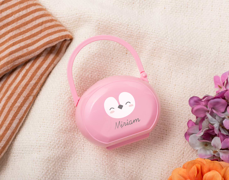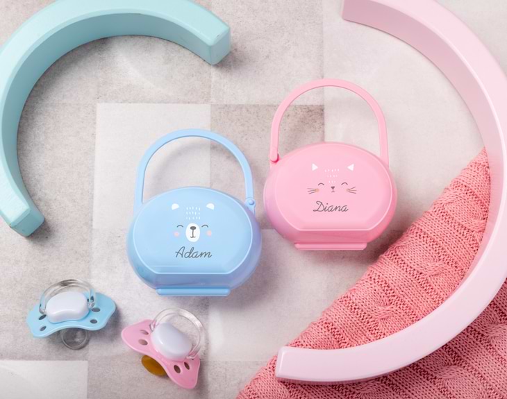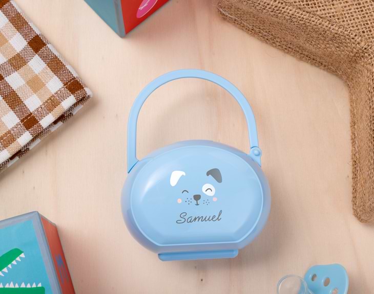 ¿Tú también tienes a esos amigos o familiares que acaban de ser padres? ¿Te han invitado a una fiesta para celebrar el nacimiento de un nuevo miembro de la familia? Sea cual sea la situación, la llegada de un bebé siempre es una gran noticia. Así que, ¿qué mejor forma de celebrarlo que con un montón de regalos? Si estás pensando en tener un detalle con los padres primerizos, este portachupetes es el regalo perfecto. Cuando los niños son muy bebés, son un poco desastre, por eso, este portachupetes es una manera de evitar la suciedad y de proteger al chupete. Es un regalo súper útil y muy práctico. Viene genial para no perder el chupete del más peque de la casa. ¡Es genial! Sin duda, los padres de la criatura te lo agradecerán. Pero lo más especial que tiene, es que es personalizable. Tú puedes escribir el nombre del recién nacido, así todos sabrán de quien este chupete tan adorable. Y te preguntarás… ¿Cómo se personaliza este portachupetes? Lo primero es añadir el producto al carrito y entrar al área de personalización. Una vez ahí, escoges el color (rosa o azul) y el estampado con la carita de un animalito. Escribes el nombre que quieras y ya nosotros nos encargamos de que quede perfecto y listo para regalar. Medidas cerrado sin asa: 7 x 8 x 4,5 cm. Medidas cerrado con asa: 10 x 8 x 4,5 cm. Medidas del asa: 7 x 4 cm. Medidas abierto: 13 x 8 x 4,5 cm.