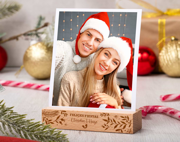 Uno de los mayores inventos de los años 20 fueron sin duda las cámaras polaroid. Con estas cámaras simplemente tenías que hacer la foto y en cuestión de segundos seguía impresa. Tenías que cuidar la foto de la luz del sol para que se revelara a la perfección, pero sin duda era una manera muy chula de hacer fotos. Si este método te sigue dando nostalgia a día de hoy nuestro portafotos de madera grabada es perfecto para ti. El diseño de este portafotos es especial Navidad. En él podrás incluir hasta dos textos que digan lo que quieras y que esté rodeado por nuestro bonito diseño Navideño de ramitas de acebo. Es el detalle ideal para regalarle a esa persona especial en estas fechas tan señaladas, decorarlo con esa foto que tanto os gusta a ambos y ponerlo adornando vuestra casa. Es una manera muy original de tener vuestras fotos expuestas. Podrás elegir la opción con foto o sin foto. Si eliges la opción con foto nosotros nos encargaremos de imprimirla en formato polaroid, si sin embargo sólo quieres el marco grabado también es posible. Con este regalo original le sacarás una sonrisa a la persona que lo reciba seguro y decorará su rincón favorito de la casa de la manera más chula. Medidas del portafotos: 1 foto: 10cm x 2 cm x 3 cm (ancho) Medidas de la foto: 8x8 cm