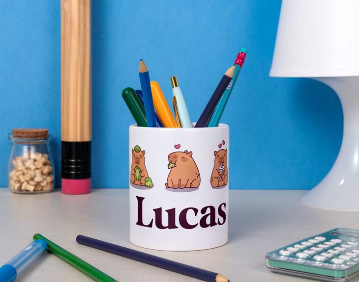 ¿A tu peque le encantan los capibaras? Entonces este portalápices de cerámica personalizado es perfecto para añadir un toque de ternura y estilo a su escritorio o habitación. Ideal para tenerlo todo a mano a la hora de hacer los deberes después del cole, ¡especialmente en este cercano regreso a clases! Con un diseño de capibaras adorables, en colores suaves y dibujos simpáticos, podrás elegir el que más te guste. Organizar sus lápices y rotuladores será mucho más divertido. Además, puedes personalizarlo con su nombre para que sea único, un regalo original ideal para su cumpleaños o para sorprenderle en la vuelta al cole. Este portalápices infantil es práctico, resistente y perfecto para mantener todo en orden mientras despierta su creatividad. Personalizarlo es muy fácil, añade el producto al carrito, elige el diseño que más te guste, escribe el nombre deseado y listo, un regalo bonito, funcional, lleno de encanto y ternura, como un capibara. Altura: 9,5 cm Diámetro: 8 cm