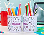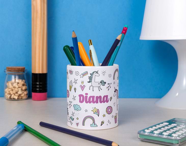 ¿Quieres tener un detalle con tu peque que sea tan mágico como inolvidable? Este portalápices de cerámica personalizado con diseño de unicornios es justo lo que buscas. Es perfecto para sorprenderle con un regalo lleno de color, fantasía e ilusión. Ideal para decorar su escritorio, dar un toque especial a su habitación y organizar todos sus lápices y rotuladores favoritos. También es una opción ideal como regalo de vuelta al cole para algún niño o niña de la familia, un vecinito del barrio o un amiguito del cole. Su diseño de unicornios fantásticos, alegre y colorido, les encantará. Además, podrás personalizarlo con el nombre que desees, convirtiéndolo en un acierto seguro, un obsequio lleno de magia. Este portalápices original no solo es precioso, sino también muy práctico para el día a día, sobre todo a la hora de hacer los deberes o mantener el escritorio ordenado. Personalizarlo es súper sencillo, solo tienes que añadir el producto al carrito, escribir el nombre que quieras y listo tendrás un portalápices práctico, bonito, duradero y, por supuesto, lleno de fantasía. Altura: 9,5 cm Diámetro: 8 cm