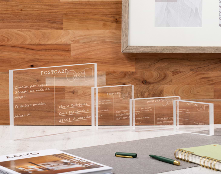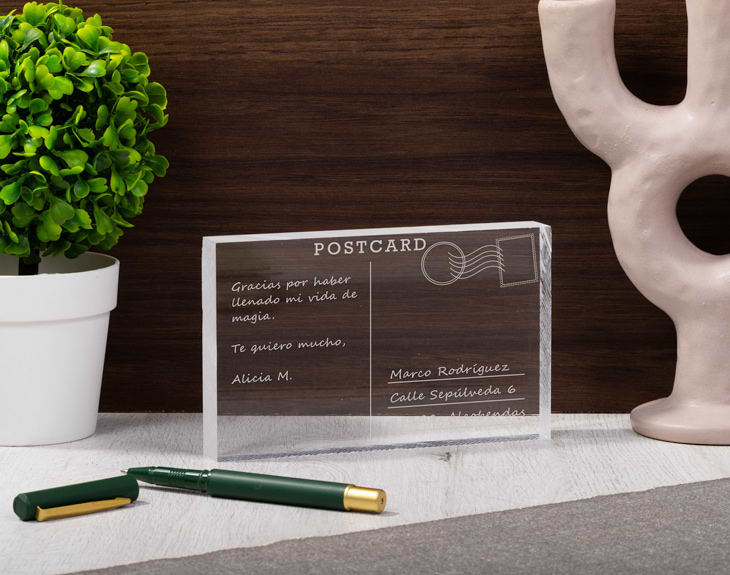 ¿Quieres mandar un mensaje de la manera más especial? Hazlo a través de esta curiosa postal en metacrilato. Hablamos de un bloque de 3 centímetros de ancho, con un diseño que emula la típica postal. En ella podrás poner, a izquierda y derecha, el texto que desees. Por cómo es el material, la grabación parece estar en 3 dimensiones. ¡Muy original! ¿El recuerdo de un viaje? ¿Un mensaje romántico? ¿La felicitación de un cumpleaños? El único límite es tu imaginación. Tenemos hasta cuatro tamaños diferentes: - 29,5 x 19,5 x 2 cm. - 15,5 x 9,5 x 2 cm. - 13 x 13 x 2 cm. - 9 x 13 x 2 cm.