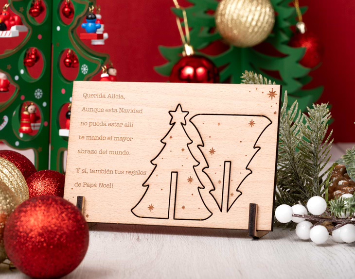En Navidad nos encanta enviar postales que recuerden a las personas de nuestro entorno lo mucho que nos importan y pensamos en ellos. Recibir una nos llena de ilusión y alegría y nos hace el día más ameno. ¿Qué te parece una postal de madera grabada? ¿Verdad que es súper original? Podrás personalizar el texto de la postal como quieras, como si de una escrita a mano se tratase y dedicarle tus mejores palabras a esa personita. Y es que con este regalo original no sólo regalas una postal, sino que también regalas un adorno de lo más original: es un arbolito de madera en tamaño mini con la inicial de la persona a la que se lo vas a regalar. Es un detalle súper chulo e ideal para aquellas personas que no tienen espacio para un árbol completo. Conseguirlo es súper sencillo: simplemente añade el producto al carrito y dinos que texto quieres que lleve la postal y qué inicial llevará el adorno, nosotros nos encargaremos del resto. Esta Navidad regala originalidad, verás como es el regalo que recuerda con más cariño de todo el año.