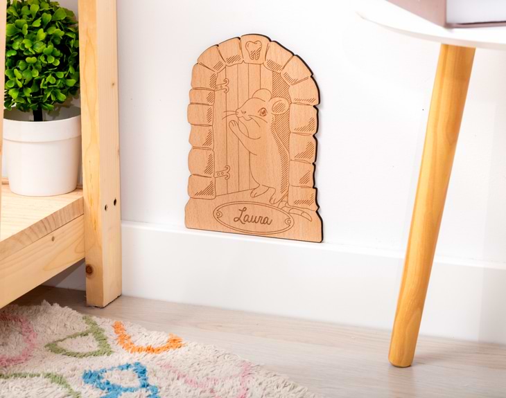 Ver la ilusión que tienen los más peques no tiene precio. ¡Es precioso! Por eso, si quieres hacer que la visita del Ratoncito Pérez sea aún más mágica, nuestra puerta del Ratoncito Pérez personalizada es perfecta para esta ocasión. Este adorno está diseñado para pegar en la pared, es perfecto para añadir un toque de fantasía al ritual de dejar el diente bajo la almohada. Con su acabado en madera natural y su adorable diseño de puerta en miniatura, este adorno crea la ilusión de una entrada secreta para el Ratón Pérez. Colócala junto a la cama o en cualquier rincón especial de la habitación, y verás cómo se convierte en el centro de atención. Lo mejor es que es personalizable, podrás escribir el nombre que tú quieras. Cada vez que se caiga un diente, ¡los peques estarán llenos de emoción! Personalizar esta puerta del ratoncito pérez es muy sencillo. El primer paso a seguir consiste en añadir el producto al carrito y entrar al área de personalización. Una vez ahí, ya puedes escribir el nombre del más peque de la casa. Pronto estará perfecto y listo para regalar. ¡Será un original regalo!