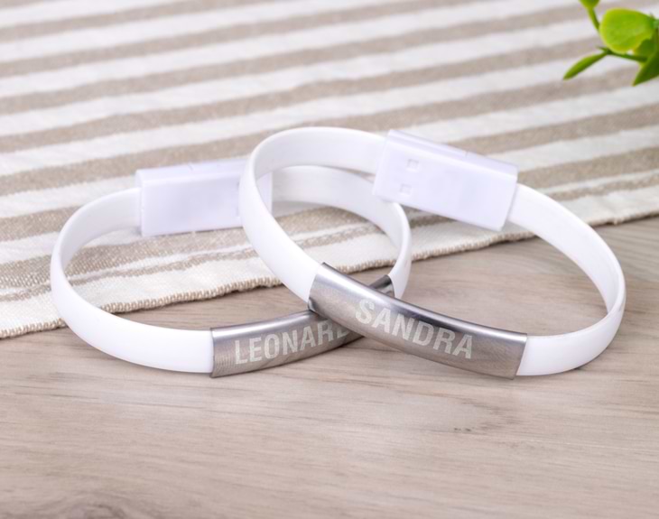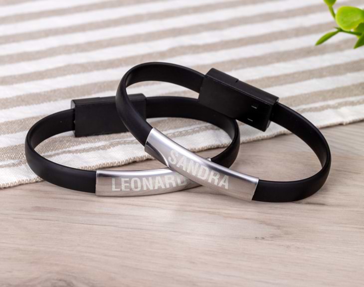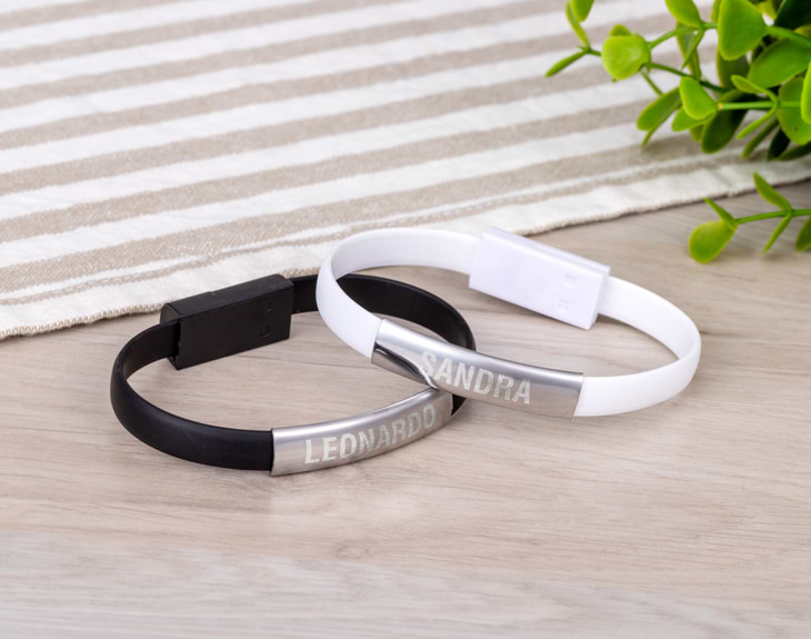 Una pulsera personalizada muy original, perfecta para sorprender a esa persona loca por la tecnología. Aunque en apariencia es una pulsera grabada (ponemos el nombre que tú quieras), en la práctica se abre y se convierte en un cable USB - Mini USB. ¡Perfecta para cargar tu móvil en cualquier lugar? Importante: la pulsera es válida para todos los dispositivos, excepto Iphone y aquellos que utilicen USB Type-C. Medidas: 22 x 1,2 x 0,8 cm.