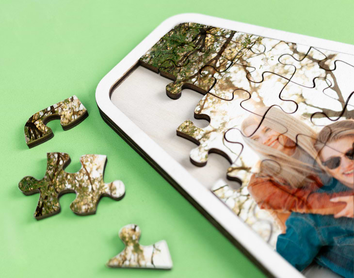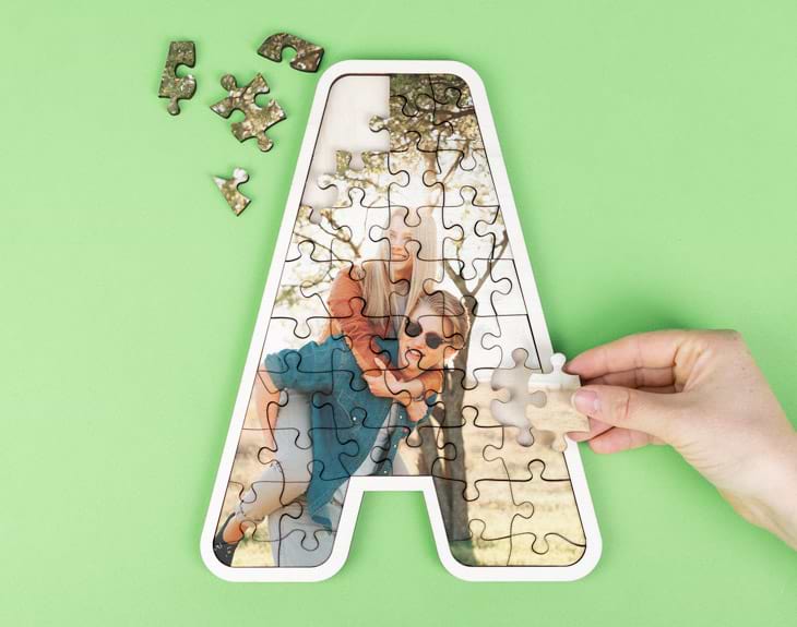 • Puzzle inicial de madera personalizado. • Tarjeta recordatoria.