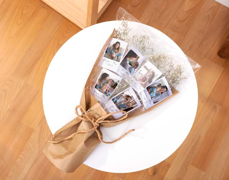• Ramo con 6 fotos polaroid y flores secas. • Tira de luces led alambre. • Tarjeta Recordatoria.