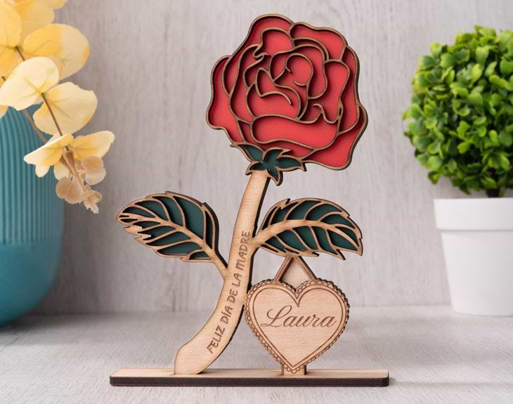 Además de todos los productos que hemos mencionado, podrás ver en la categoría un montón de diseños fabricados en madera: un portavelas grabado, una moto grabada para parejas, un colgador de corbatas, y muchos objetos más fabricados en madera.
