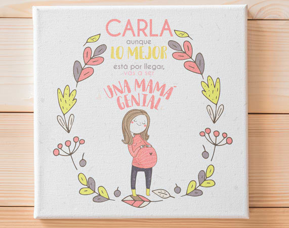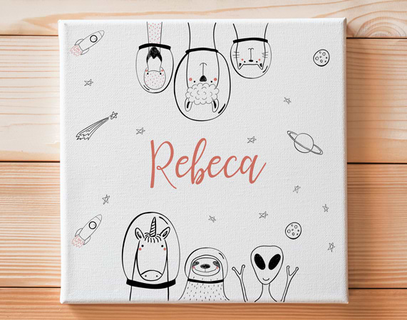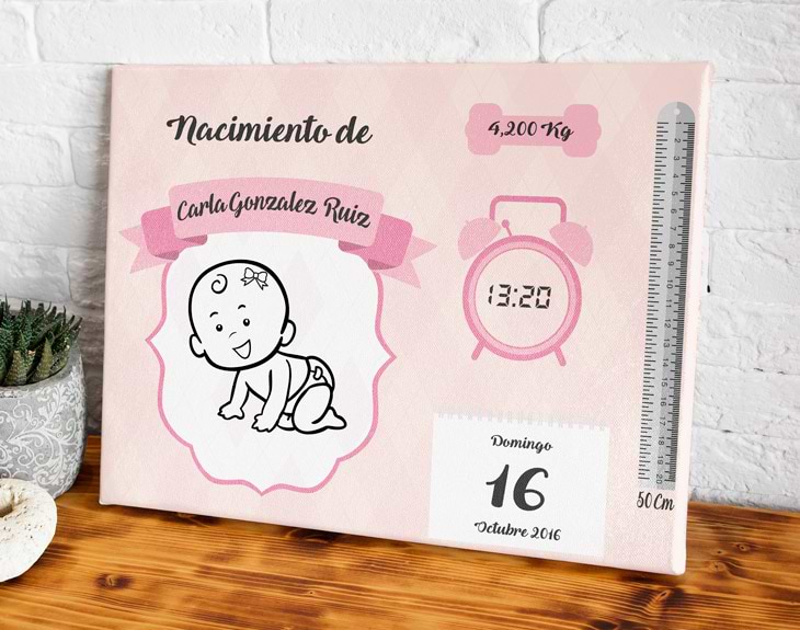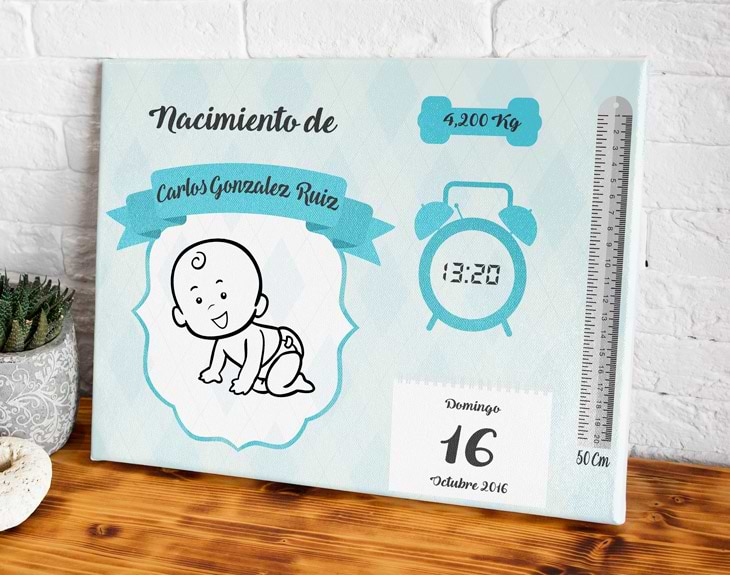 Tenemos más lienzos con efecto (como el de resaltar colores o el que simula a Polaroids), pero queremos hablaros también de los productos infantiles. Nos referimos al cuadrito para bebé (si nos das el nombre lo pondremos junto con un diseño precioso de una cigüeña) y el lienzo nacimiento.