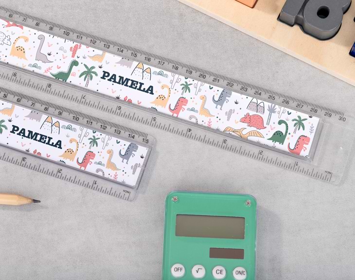 ¿Tu peque es fan de los dinosaurios y no se cansa de imaginar aventuras prehistóricas llenas de color? Entonces este pack de reglas escolares personalizadas es perfecto para él o ella. Con un diseño alegre y lleno de dinosaurios de colores, este dúo de reglas convertirá cada día de clase en una auténtica expedición jurásica llena de creatividad. Este set ha sido diseñado para hacer más fácil y divertido el día a día en el colegio. Incluye una regla escolar de 30 cm, ideal para trabajos técnicos o actividades de geometría, y una regla escolar de 15 cm, perfecta para tener siempre a mano en el estuche o la mochila. Gracias a la opción de personalización con el nombre del niño o la niña, se garantiza una mayor organización y se evitan pérdidas o confusiones en el aula. Personalizar este pack es muy sencillo: solo tienes que añadir el producto al carrito, acceder a nuestro diseñador y escribir el nombre que desees en cada campo de texto. Puedes poner el mismo nombre en ambas reglas o modificarlas para que sean diferentes. Haz clic en el texto, cambia lo que quieras y acepta. Luego, elige si quieres personalizar solo una regla o ambas. Tú decides. Y listo, tendrás un pack de reglas transparentes que hará que medir, subrayar o dibujar sea mucho más divertido. Convierte la vuelta al cole en una aventura entre dinosaurios y que empiece la diversión. Medidas: Grande: 31 x 5 cm Pequeña: 16 x 4,7 cm Material: plástico transparente.
