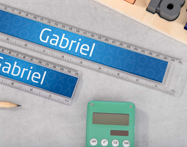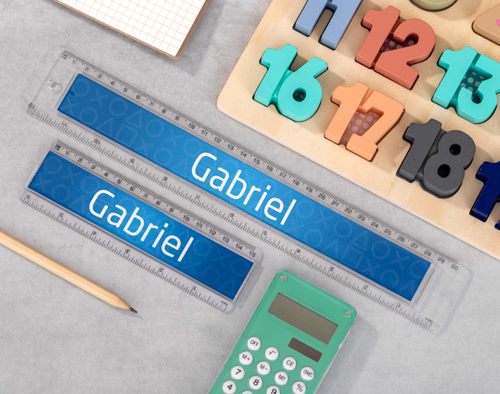 Si tu peque disfruta de todo lo relacionado con el mundo digital y los videojuegos, este pack de reglas escolares transparentes con diseño de iconos play es justo lo que necesita. Con un estilo moderno, lleno de color e inspirado en el universo tecnológico, transmite una estética divertida, dinámica y actual. Son perfectas para el regreso a clases y harán que cada tarea, dibujo o actividad sea mucho más entretenida. Este pack de reglas para el cole combina funcionalidad y comodidad: la regla pequeña (15 cm) es práctica y fácil de llevar en el estuche o la mochila, ideal para usar en cualquier momento. La regla grande (30 cm), por su parte, permite realizar mediciones más detalladas y trabajos técnicos. Juntas, ofrecen el equilibrio perfecto para el día a día en clase. Y lo mejor de todo es que este kit de reglas personalizables te permite añadir el nombre que quieras en ambas. Puedes diseñarlas iguales o con textos diferentes: tú decides. Además de quedar estupendas, ayudarán a tu peque a mantener su material identificado y evitar pérdidas. Personalizar este pack es muy fácil: solo tienes que añadirlo al carrito, acceder a nuestro diseñador y escribir el nombre que desees en cada campo de texto. Así tendrás un regalo para la vuelta al cole único, con estilo y perfecto para sorprender antes del primer día de clase. Medidas: Grande: 31 x 5 cm Pequeña: 16 x 4,7 cm Material: plástico transparente.