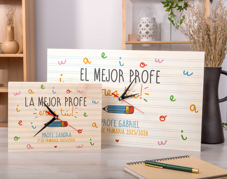Si queréis sorprender a vuestro o vuestra profe por el final de las clases, este reloj personalizado es la opción perfecta. Este reloj de madera es una bonita y original forma de darle las gracias a vuestro profe por todo lo que habéis aprendido en sus clases y de decirle lo mucho que valoráis todo su trabajo. Seguro que le hace mucha ilusión que todos sus alumnos participen en darle un detalle tan chulo como este. Simplemente nos tenéis que decir el nombre de vuestro o vuestra profe y el nombre de vuestro curso, nosotros nos encargaremos del resto. ¡Le encantará! Tienes dos opciones de compra: Medidas reloj de pared: 49,5 x 30 cm. Medidas reloj de mesa: 27 x 20 cm. Importante: Las maderas tienen vetas y estas quedan reflejadas en la imagen. Instalación: El reloj de pared cuenta con agujeros en la parte posterior, hechos a medida por si quieres colgarlo utilizando tornillos, chinchetas, o lo que creas conveniente. ¡Cabrán perfectamente en los agujeros que vienen incluidos en la madera!
