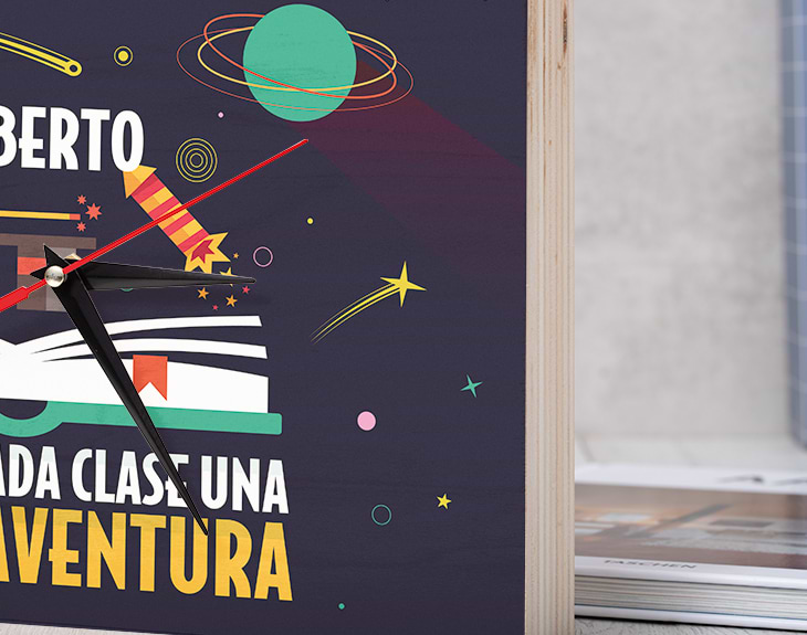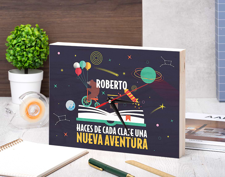 Si queréis darle una sorpresa a vuestro o vuestra profe por el final de curso, este reloj personalizado es el regalo perfecto. Si vuestro profe hace que las clases sean divertidas y cada día aprendéis cosas nuevas, que mejor forma de agradecérselo que con este reloj de madera. Seguro que le hace mucha ilusión y lo pondrá en su lugar favorito de la clase para que todo el mundo lo vea. Simplemente nos tendréis que decir el nombre de vuestro o vuestra profe y nosotros lo añadiremos a este diseño tan chulo. ¿No os parece una gran idea? Tienes dos opciones de compra: Medidas reloj de pared: 49,5 x 30 cm. Medidas reloj de mesa: 27 x 20 cm. Importante: Las maderas tienen vetas y estas quedan reflejadas en la imagen. Instalación: el reloj de pared cuenta con agujeros en la parte posterior, hechos a medida por si quieres colgarlo utilizando tornillos, chinchetas, o lo que creas conveniente. ¡Cabrán perfectamente en los agujeros que vienen incluidos en la madera!