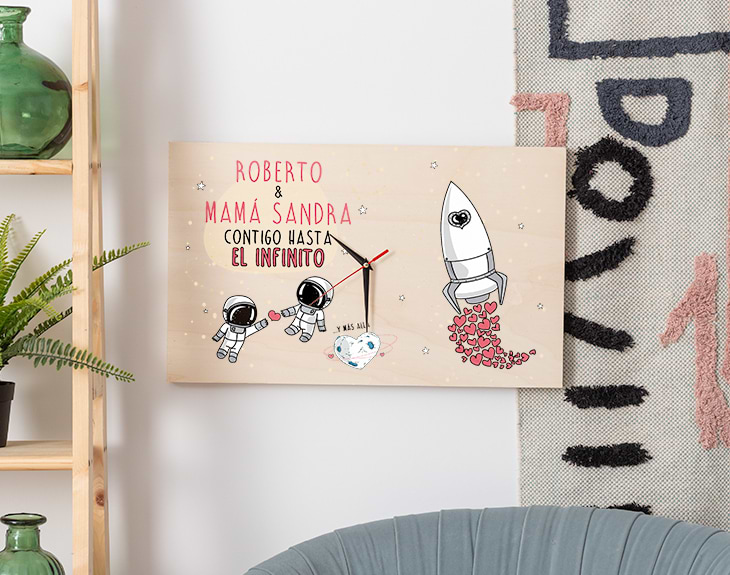 ¿A su lado el tiempo pasa volando? Si quieres sorprender a tu persona preferida con un detalle muy especial para demostrarle lo importante que es en tu vida, nuestro reloj de madera personalizado "Contigo hasta el infinito" es una idea maravillosa. Simplemente tienes que decirnos vuestros nombres para insertarlos en el diseño y será la forma más original y emotiva de decirle que te da igual el lugar con tal de estar cerca suya...¿No te parece una idea preciosa? Tienes dos opciones de compra: Medidas reloj de pared: 49,5 x 30 cm. Medidas reloj de mesa: 27 x 20 cm. Importante: Las maderas tienen vetas y estas quedan reflejadas en la imagen. Instalación: el reloj de pared cuenta con agujeros en la parte posterior, hechos a medida por si quieres colgarlo utilizando tornillos, chinchetas, o lo que creas conveniente. ¡Cabrán perfectamente en los agujeros que vienen incluidos en la madera!
