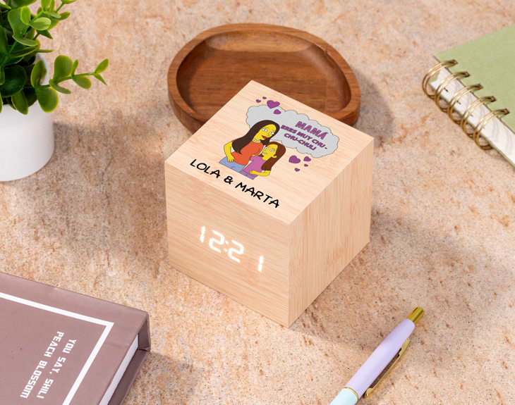 Si has crecido viendo a la familia más divertida de Springfield, seguro recuerdas con mucho cariño esas tardes junto a tu madre. ¡Qué mejor manera de revivir esos momentos que con un regalo original y único! Te traemos nuestro reloj-cubo personalizado con diseño "Madre Simpson", el detalle perfecto para demostrarle lo especial que es y, de paso, ayudarla a no quedarse dormida nunca. ¡Le encantará! Este reloj tan original será el complemento perfecto para su mesita de noche. Pero lo mejor de todo es que es personalizable. ¡Podrás crear tu propio personaje Simpson! Diseña a ti y a tu mamá a vuestro gusto, eligiendo los rasgos, accesorios y fondos. ¡Será muy divertido! Además, es el regalo ideal para cumpleaños o, por supuesto, para el Día de la Madre. Personalizarlo es muy fácil. Solo tienes que añadir el producto al carrito y acceder al área de personalización. Ahí llegará la parte más divertida: ¡crear vuestros personajes! Después podrás añadir vuestros nombres debajo. Un regalo original para fans de Los Simpsons que sin duda le encantará. Medidas: 7,5 cm de lado.