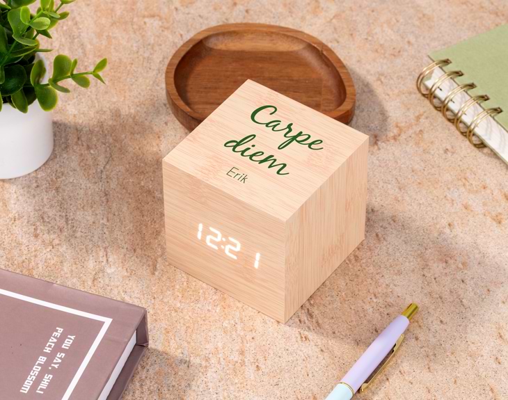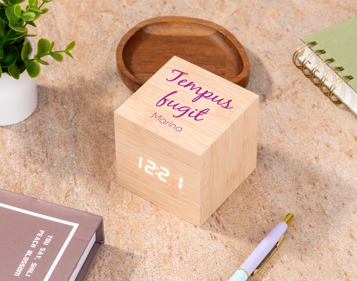 • Reloj-cubo de madera personalizado. • Tarjeta Recordatoria.