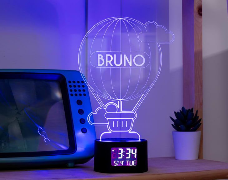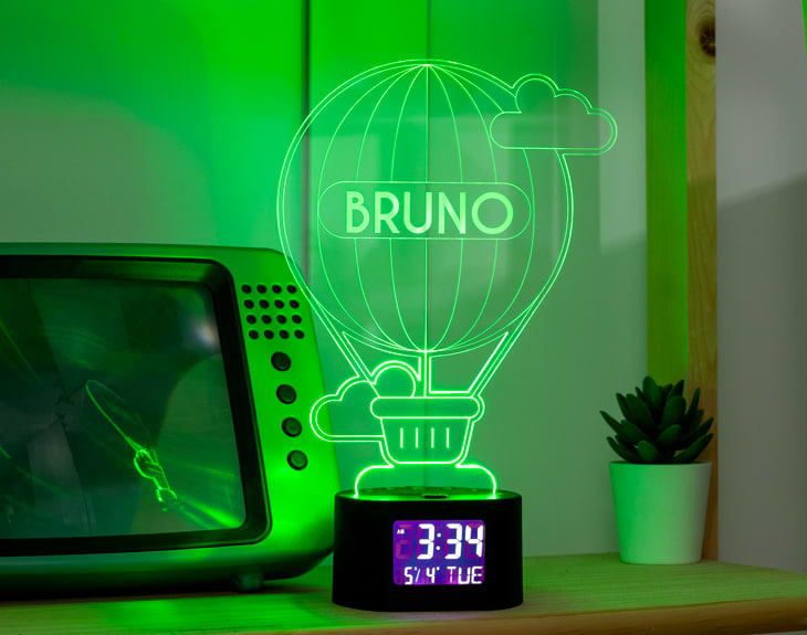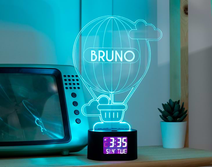 Reloj-despertador con forma de globo, perfecto para iluminar los despertares de esas personas que sueñan con dar la vuelta al mundo. No solo es un regalo perfecto para viajeros, personas aventuras o simplemente culos inquietos: en realidad, es una buena idea para cualquier persona. ¿Sabes por qué? ¡Porque se puede personalizar con el nombre que tú quieras! Importante: el propio reloj te dará la posibilidad de elegir el color de las luces. Si pulsas una vez te saldrá un color, si pulsas de nuevo, aparecerá otro, y así sucesivamente. También podrás elegir la opción intermitente: ¡todas las luces creando un festín de colores! Medidas aproximadas de la base: 8,5x7,5x5cm. Importante: puedes encenderlo usando pilas (para poner en marcha el reloj) y conectándolo a la luz (para que se ilumine). Importante: la pantalla del reloj muestra la hora ininterrumpidamente, y tiene un botón “light zzz” para que se encienda la luz durante unos pocos segundos. Importante: pilas no incluidas.