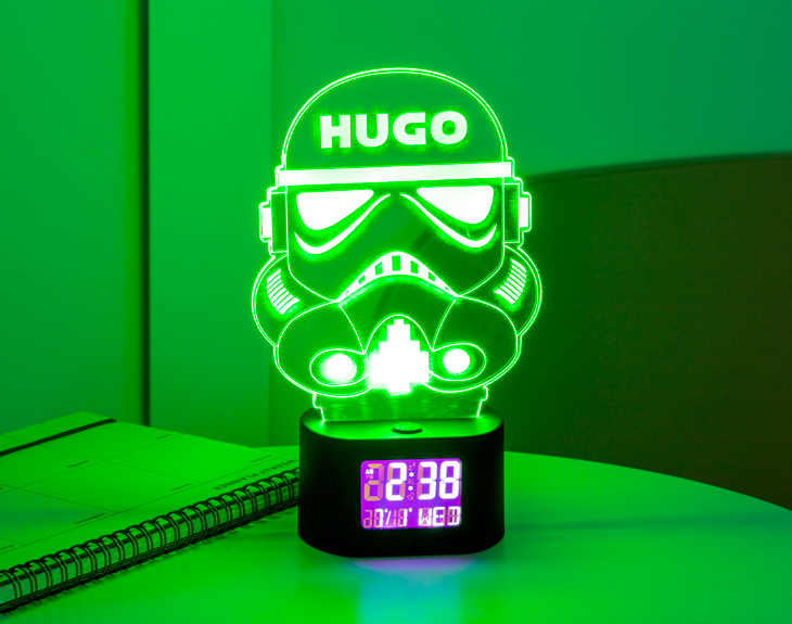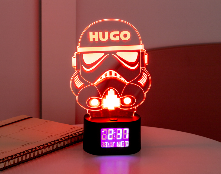 Todo fan de Star Wars que se precie tiene que tener este reloj-despertador personalizado en su mesilla de noche. Ni más ni menos que un abrumador soldado imperial (o stormtrooper), con tu nombre grabado en la frente de su casco. Además, se ilumina y cambia de color, por lo que nunca te aburrirás de este reloj-despertador. ¡Que la fuerza os acompañe cada mañana! Importante: el propio reloj te dará la posibilidad de elegir el color de las luces. Si pulsas una vez te saldrá un color, si pulsas de nuevo, aparecerá otro, y así sucesivamente. También podrás elegir la opción intermitente: ¡todas las luces creando un festín de colores! Medidas aproximadas de la base: 8,5x7,5x5cm. Importante: puedes encenderlo usando pilas (para poner en marcha el reloj) y conectándolo a la luz (para que se ilumine). Importante: la pantalla del reloj muestra la hora ininterrumpidamente, y tiene un botón “light zzz” para que se encienda la luz durante unos pocos segundos. Importante: pilas no incluidas. Puedes encenderlo usando pilas (para poner en marcha el reloj) y conectándolo a la luz (para que se ilumine).