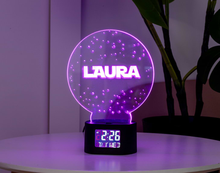 Star Wars es la obra cumbre de la humanidad. Por eso, cualquier ser humano que se precie debería tener en su mesilla de noche este fantástico reloj-despertador. Se personaliza con el nombre que quieras, utilizando la misma tipografía que la mítica saga que creó George Lucas y que ahora sigue desarrollando Disney. Si quieres sorprender a un fan de las aventuras de la familia Skywalker, este es el regalo perfecto. Ni siquiera un Sith te diría que este es un mal despertador. Importante: el propio reloj te dará la posibilidad de elegir el color de las luces. Si pulsas una vez te saldrá un color, si pulsas de nuevo, aparecerá otro, y así sucesivamente. También podrás elegir la opción intermitente: ¡todas las luces creando un festín de colores! Importante: puedes encenderlo usando pilas (para poner en marcha el reloj) y conectándolo a la luz (para que se ilumine). Medidas aproximadas: 19 x 15 cm. Medidas aproximadas de la base: 8,5x7,5x5cm. Importante: la pantalla del reloj muestra la hora ininterrumpidamente, y tiene un botón “light zzz” para que se encienda la luz durante unos pocos segundos. Importante: pilas no incluidas.