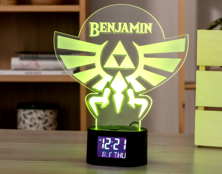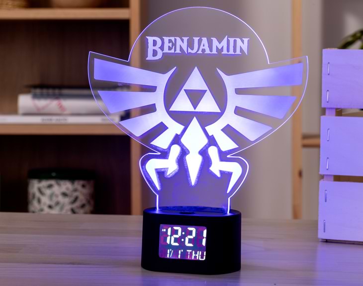 Si le gusta el Zelda, le gustará este reloj-despertador personalizado. Cambia de color, tiene todo el poder de la trifuerza y encima llevará su nombre grabado en la parte superior. ¡Mejor imposible! Sin duda, es el despertador más vendido en todo el reino de Hyrule. Rompe unas cuantas vasijas, consigue unas pocas rupias y tendrás un regalo perfecto para todo amante de los videojuegos. Importante: el propio reloj te dará la posibilidad de elegir el color de las luces. Si pulsas una vez te saldrá un color, si pulsas de nuevo, aparecerá otro, y así sucesivamente. También podrás elegir la opción intermitente: ¡todas las luces creando un festín de colores! Medidas aproximadas de la base: 8,5x7,5x5cm. Importante: puedes encenderlo usando pilas (para poner en marcha el reloj) y conectándolo a la luz (para que se ilumine). Importante: la pantalla del reloj muestra la hora ininterrumpidamente, y tiene un botón “light zzz” para que se encienda la luz durante unos pocos segundos. Importante: pilas no incluidas.