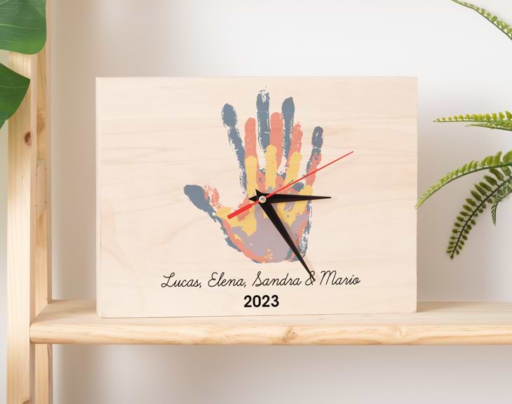 Si lo mejor que te ha podido pasar es tener una familia así de especial, nuestro reloj de madera "Una familia que deja huella" es perfecto para decorar vuestro hogar. Se trata de un diseño súper especial con las huellas de cada uno de vosotros y los nombres. Solamente nos tenéis que decir el número de miembros y vuestros nombres. Tienes dos opciones de compra: Medidas reloj de pared: 49,5 x 30 cm. Medidas reloj de mesa: 27 x 20 cm. Importante: Las maderas tienen vetas y estas quedan reflejadas en la imagen. Instalación: El reloj de pared cuenta con agujeros en la parte posterior, hechos a medida por si quieres colgarlo utilizando tornillos, chinchetas, o lo que creas conveniente. ¡Cabrán perfectamente en los agujeros que vienen incluidos en la madera!
