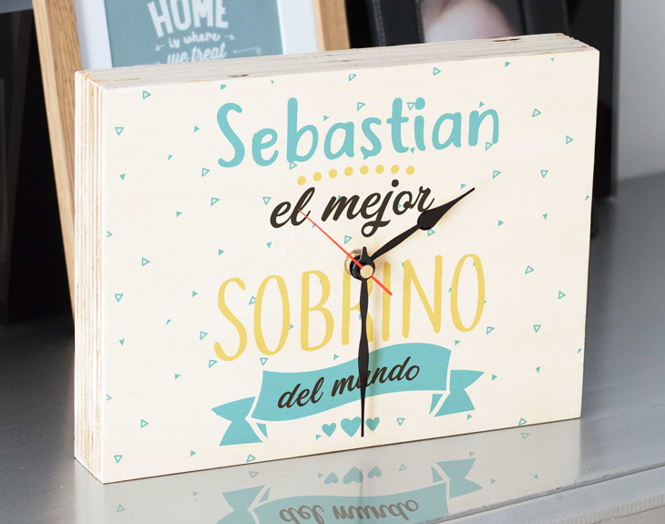 ¿Quieres darle una sorpresa a tu sobrino favorito? Este reloj personalizado con su nombre es el regalo perfecto. Aprovecha su cumpleaños, las Navidades o cualquier ocasión especial para darle este súper regalo a tu sobrino. Seguro que así seguirás siendo el tío enrollado. Solo nos tendrás que decir su nombre y nosotros lo añadiremos a este diseño tan chulo. Además de ser un detalle muy original, podrá ponerlo como decoración en su habitación. Así nunca se olvidará de su tío favorito. Tienes dos opciones de compra: Medidas reloj de pared: 49,5 x 30 cm. Medidas reloj de mesa: 27 x 20 cm. Importante: Las maderas tienen vetas y estas quedan reflejadas en la imagen. Instalación: El reloj de pared cuenta con agujeros en la parte posterior, hechos a medida por si quieres colgarlo utilizando tornillos, chinchetas, o lo que creas conveniente. ¡Cabrán perfectamente en los agujeros que vienen incluidos en la madera!