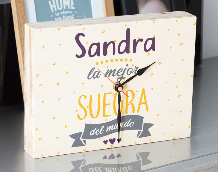 Dale una sorpresa a tu suegra con este reloj de madera personalizado y demuestra que una buena relación entre suegra y nuera es posible. Aprovecha su cumpleaños o alguna ocasión especial para darle un regalo muy especial y que nunca olvidará. Solo nos tendrás que decir el nombre de tu suegra y nosotros lo añadiremos a este diseño tan chulo. Además de ser un bonito detalle lo podrá poner en su casa como decoración. ¿Se te ocurre un regalo mejor? Tienes dos opciones de compra: Medidas reloj de pared: 49,5 x 30 cm. Medidas reloj de mesa: 27 x 20 cm. Importante: Las maderas tienen vetas y estas quedan reflejadas en la imagen. Instalación: el reloj de pared cuenta con agujeros en la parte posterior, hechos a medida por si quieres colgarlo utilizando tornillos, chinchetas, o lo que creas conveniente. ¡Cabrán perfectamente en los agujeros que vienen incluidos en la madera!