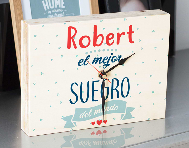 Si estás buscando una forma de sorprender a tu suegro este reloj personalizado de madera es la forma perfecta. Con este detalle le podrás decir que es el mejor suegro del mundo, seguro que te llevas un buen abrazo de su parte. Solo nos tendrás que decir su nombre y lo grabaremos en este diseño tan chulo. Seguro que le hará muchísima ilusión y romperás con el dicho de que un suegro y un yerno no pueden llevarse bien. ¿No te parece un regalo súper original? Tienes dos opciones de compra: Medidas reloj de pared: 49,5 x 30 cm. Medidas reloj de mesa: 27 x 20 cm. Importante: Las maderas tienen vetas y estas quedan reflejadas en la imagen. Instalación: el reloj de pared cuenta con agujeros en la parte posterior, hechos a medida por si quieres colgarlo utilizando tornillos, chinchetas, o lo que creas conveniente. ¡Cabrán perfectamente en los agujeros que vienen incluidos en la madera!