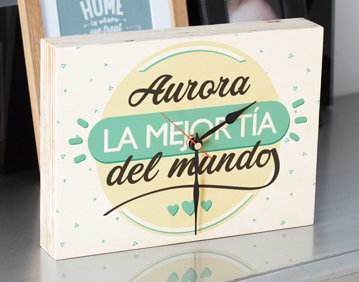 ¿Estás pensando hacerle un regalo original a tu tía pero no sabes el que? Este reloj personalizado de madera es la solución perfecta. Aprovecha cualquier ocasión, su cumpleaños, las Navidades para sorprender a tu tía con este detalle tan especial. Podrás personalizar este reloj de madera con su nombre y seguro que le hará mucha ilusión. Además de ser un detalle muy bonito, lo podrá poner en su casa de decoración y cada vez que mire la hora se acordará de su sobrino/a favorito. Tienes dos opciones de compra: Medidas reloj de pared: 49,5 x 30 cm. Medidas reloj de mesa: 27 x 20 cm. Importante: Las maderas tienen vetas y estas quedan reflejadas en la imagen. Instalación: el reloj de pared cuenta con agujeros en la parte posterior, hechos a medida por si quieres colgarlo utilizando tornillos, chinchetas, o lo que creas conveniente. ¡Cabrán perfectamente en los agujeros que vienen incluidos en la madera!