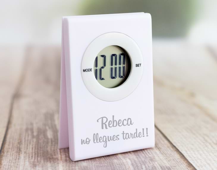 Elegante reloj de sobremesa digital con clip integrado. Se personaliza con el nombre, la fecha o el pequeño texto que tú nos digas, creando un elemento único para cualquier despacho, mesa trabajo o sala de estudio. Su diseño minimalista hace que quede bien en cualquier lugar. Por cierto, el reloj tiene una pinta, por lo que será idóneo para guardar una pequeña foto, un papelito con un recordatorio o cualquier cosa que se te ocurra. Incluye pila de botón, para que puedas ponerlo a funcionar desde el mismo momento en que te llegue. Medidas: 8,5x5,5 cm