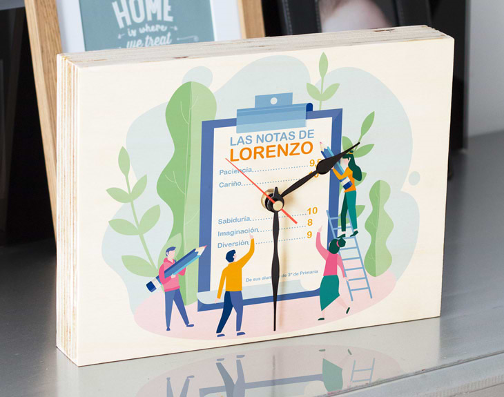 Si este año estáis muy contentos con las notas que os ha puesto vuestro o vuestra profe, ahora es momento de que vosotros le evaluéis. Este reloj personalizado es un regalo divertido y original para sorprender a vuestro profe favorito. Aprovechad el final de curso, juntaros todos los de clase y decidid que nota le podríais a vuestro profe en asignaturas tan importantes como la sabiduría, la paciencia o el cariño. Seguro que le hace muchísima ilusión y colocará este reloj en un lugar de la clase para que todo el mundo lo ves. Es un regalo muy original y divertido, ¿no os parece? Tienes dos opciones de compra: Medidas reloj de pared: 49,5 x 30 cm. Medidas reloj de mesa: 27 x 20 cm. Importante: Las maderas tienen vetas y estas quedan reflejadas en la imagen. Instalación: el reloj de pared cuenta con agujeros en la parte posterior, hechos a medida por si quieres colgarlo utilizando tornillos, chinchetas, o lo que creas conveniente. ¡Cabrán perfectamente en los agujeros que vienen incluidos en la madera!