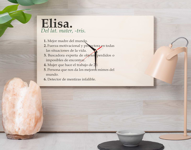 Si te pusieran un folio en blanco para escribir todo lo que sientes por tu madre, ¿serías capaz? Este reloj de madera está pensado para todos aquellos hijos que no saben cómo decirle a su mamá que es la mejor. Solo necesitamos su nombre, y personalizaremos esta breve definición de tu madre para que le des una sorpresa súper chula. Tienes dos opciones de compra: Medidas reloj de pared: 49,5 x 30 cm. Medidas reloj de mesa: 27 x 20 cm. Importante: Las maderas tienen vetas y estas quedan reflejadas en la imagen. Instalación: El reloj de pared cuenta con agujeros en la parte posterior, hechos a medida por si quieres colgarlo utilizando tornillos, chinchetas, o lo que creas conveniente. ¡Cabrán perfectamente en los agujeros que vienen incluidos en la madera!