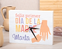 El reloj personalizado perfecto para sorprender a la mamá primeriza de la familia en su día. Un regalo muy especial para que siempre se acuerde de su primer Día de la Madre. Seguro que se emociona muchísimo cuando vea este reloj con su nombre y este diseño tan emotivo. Ahora que su vida ha cambiado radicalmente y al día le faltan horas, un reloj así de guay le vendrá perfecto para organizar su tiempo. ¡Le encantará! Tienes dos opciones de compra: Medidas reloj de pared: 49,5 x 30 cm. Medidas reloj de mesa: 27 x 20 cm. Instalación: El reloj de pared cuenta con agujeros en la parte posterior, hechos a medida por si quieres colgarlo utilizando tornillos, chinchetas, o lo que creas conveniente. ¡Cabrán perfectamente en los agujeros que vienen incluidos en la madera!