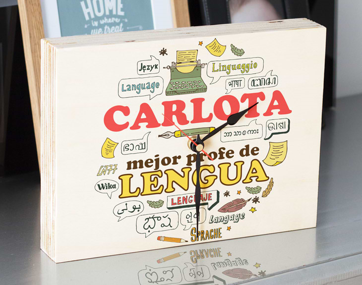Si la gramática y la literatura nunca te han parecido tan divertidos e interesantes como este año, seguro que ha sido por tu súper profe de Lengua. Que mejor forma de agradecérselo que con este reloj personalizado. Aprovecha el final de las clases y dale una sorpresa muy original a tu profe. Seguro que este reloj de madera empezará a presidir la clase para que todo el mundo lo vea. Solo nos tienes que decir el nombre de tu profe y nosotros lo añadiremos a este divertido diseño. ¡Le encantará! Tienes dos opciones de compra: Medidas reloj de pared: 49,5 x 30 cm. Medidas reloj de mesa: 27 x 20 cm. Importante: Las maderas tienen vetas y estas quedan reflejadas en la imagen. Instalación: el reloj de pared cuenta con agujeros en la parte posterior, hechos a medida por si quieres colgarlo utilizando tornillos, chinchetas, o lo que creas conveniente. ¡Cabrán perfectamente en los agujeros que vienen incluidos en la madera!