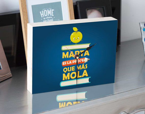 ¿Tu profe es la típica que sigue dando clase una vez acabada la clase? Si siempre tenéis que avisarle de la hora, nuestro reloj de madera personalizado es el regalo perfecto. Un detalle muy útil tiene un diseño de lo más divertido y emotivo. Además puede colgarlo al lado de la pizarra o ponerlo en su mesa. Si tu profe es la que más mola del mundo, es hora de decírselo. Tienes dos opciones de compra: Medidas reloj de pared: 49,5 x 30 cm. Medidas reloj de mesa: 27 x 20 cm. Importante: Las maderas tienen vetas y estas quedan reflejadas en la imagen. Instalación: El reloj de pared cuenta con agujeros en la parte posterior, hechos a medida por si quieres colgarlo utilizando tornillos, chinchetas, o lo que creas conveniente. ¡Cabrán perfectamente en los agujeros que vienen incluidos en la madera!