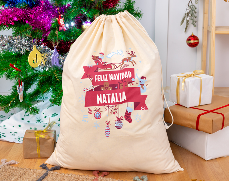 ¿Tienes un regalo especial para una persona aún más especial? Es muy importante lo que le has comprado y cómo se lo vas a dar. Para que la dejes sin palabras estas fiestas, entrégale todo lo que le has comprado en este saco de regalos personalizado. En lugar de tener que escribir su nombre a mano, ¡lo tendrás impreso en un precioso diseño navideño! Copos de nieve, bolas del árbol, muñecos de nieve, renos... No faltará nada en este colorido saco de yute que quedará ideal debajo del árbol. Más que su interior, la propia bolsa será el regalo navideño más original. Después del día 25, podréis seguir utilizándolo para todo lo que necesitéis recordando esta gran Navidad. Disfruta del diseño con tu nombre bien grande a color sobre el saco de dimensiones 65x50cm (aproximadamente). Además, el material de la bolsa es natural y biodegradable.