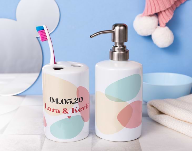• Dispensador de jabón personalizada. • Portacepillos personalizado. • Tarjeta recordatoria.