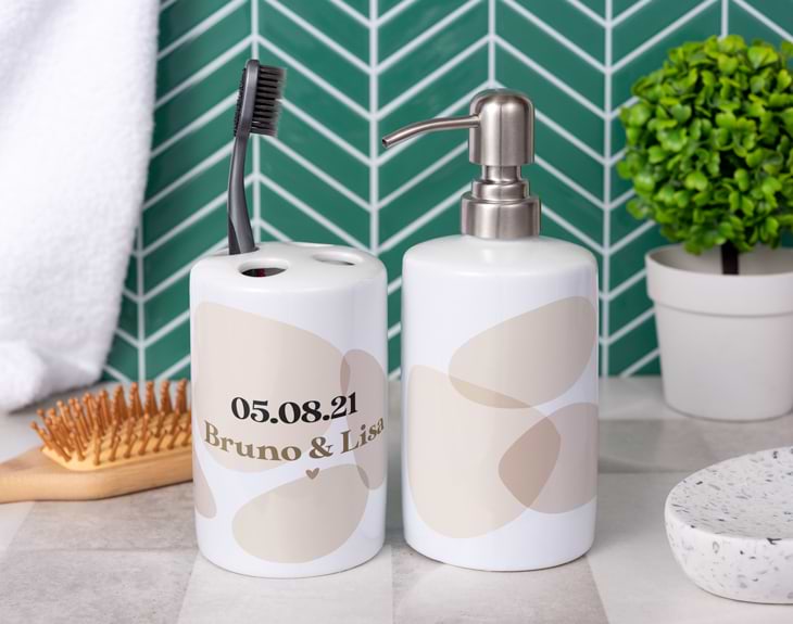 ¿Estás preparando la mudanza para irte a vivir con tu pareja? ¿O se acerca vuestro aniversario? Sea la opción que sea, aquí tenemos una idea original para la decoración de vuestro baño. Se trata de un set de jabonera y portacepillos personalizados. Cada detalle es importante para mantener viva la llama y no caer en la rutina. Por eso, esteset de jabonera y portacepillos personalizados es ideal para regalarle a tu pareja. Así cada vez que uséis el cepillo de dientes o la jabonera, os sacará la típica sonrisita tonta, recordando el día en que os conocisteis o la fecha de vuestra boda. Este set de jabonera y portacepillos se puede personalizar poniendo una fecha importante que haya unido a la pareja y además, ser pueden poner los nombres de ambos. Las formas circulares también se pueden personalizar eligiendo el color de relleno. Ambos productos están fabricados con cerámica. Material: cerámica. Altura del portacepillos: 11,5 cm. Altura de la jabonera: 18 cm. Diámetro: 7 cm.