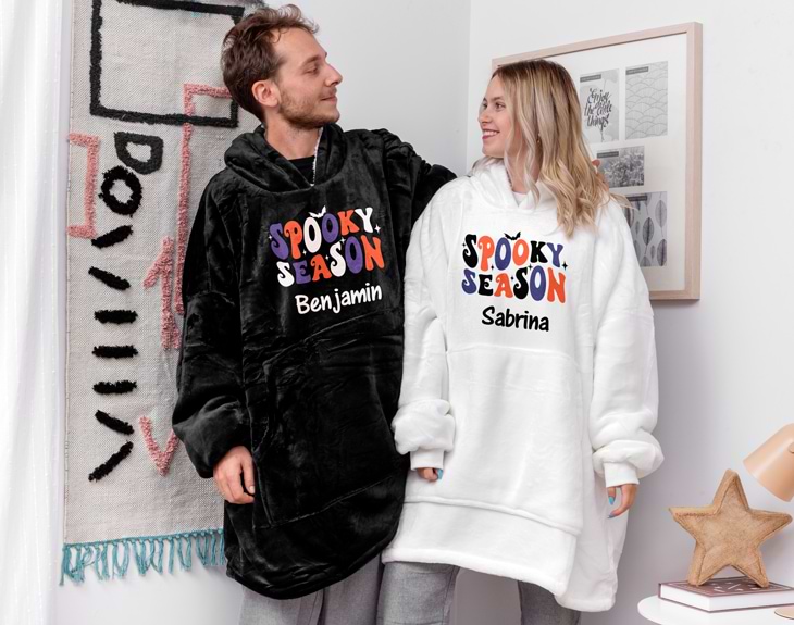 ¿Buscas un regalo original para una auténtica fan de Halloween? Este snuggie personalizado oversize es justo lo que necesitas para sorprenderla. Una mezcla perfecta entre manta y sudadera, ideal para acurrucarse en el sofá y disfrutar de una buena maratón de pelis de miedo… ¡bien calentita! Imagina su cara cuando llegue la Spooky Season y pueda estrenar su propia sudadera manta con diseño de Halloween. Está confeccionada en poliéster suave, es de talla única (¡le quedará genial a cualquiera!) y tiene detalles que enamoran: bolsillo delantero para calentar las manos, capucha mullidita y ese extra de confort que solo una batamanta puede dar. Además, puedes personalizarla con su nombre. Solo tienes que añadir el producto al carrito y acceder al área de personalización. Ahí podrás escribir el nombre que quieras. Es el regalo perfecto para quienes adoran el otoño, el sofá, las pelis de miedo y, sobre todo, disfrutar de momentos únicos con algo tan especial como su propia batamanta personalizada. ¡Haz que este Halloween sea inolvidable! Este producto es de talla única. Material: poliéster. Color: blanco o negro. Medidas aproximadas: 90 centímetros de largo x 90 centímetros de ancho (de axila a axila)