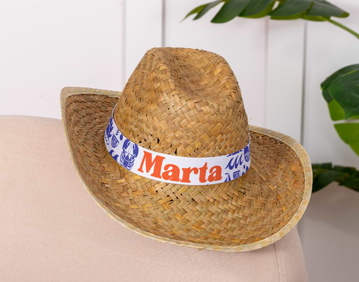 • Sombrero de paja con cinta personalizada. • Tarjeta recordatoria.