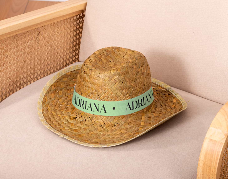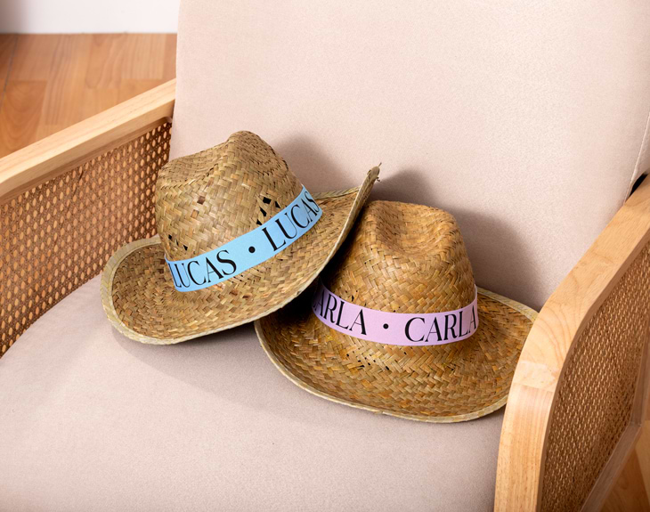 • Sombrero de paja con cinta personalizada. • Tarjeta recordatoria.